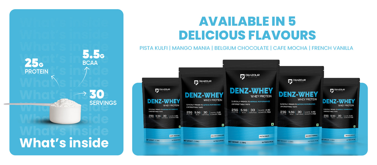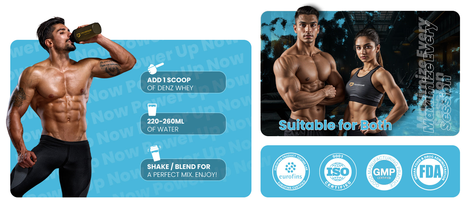 Add 1 heaping scoop (approximately 36g) of Denz-Whey Protein to 200-240ml of water or milk. Shake for 20-30 seconds, and enjoy the smooth, delicious protein.