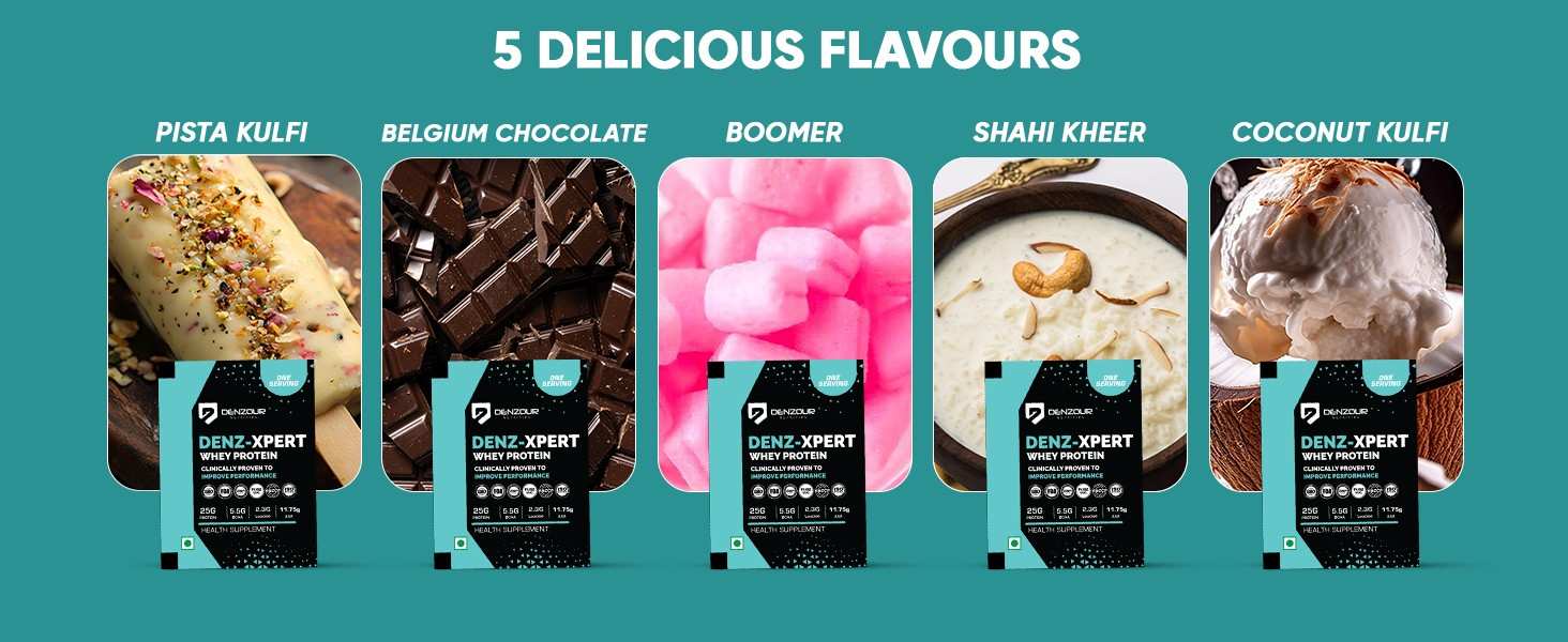 “Best tasting whey protein” is searched quite a lot. Denz-Xpert makes it taste like treats like Belgium Chocolate, Pista Kulfi, Shahi Kheer, Boomer, and Coconut Kulfi. For a normal milk shake choose the chocolate but if you want a bit of India in your whey, then kulfi and kheer are nice.