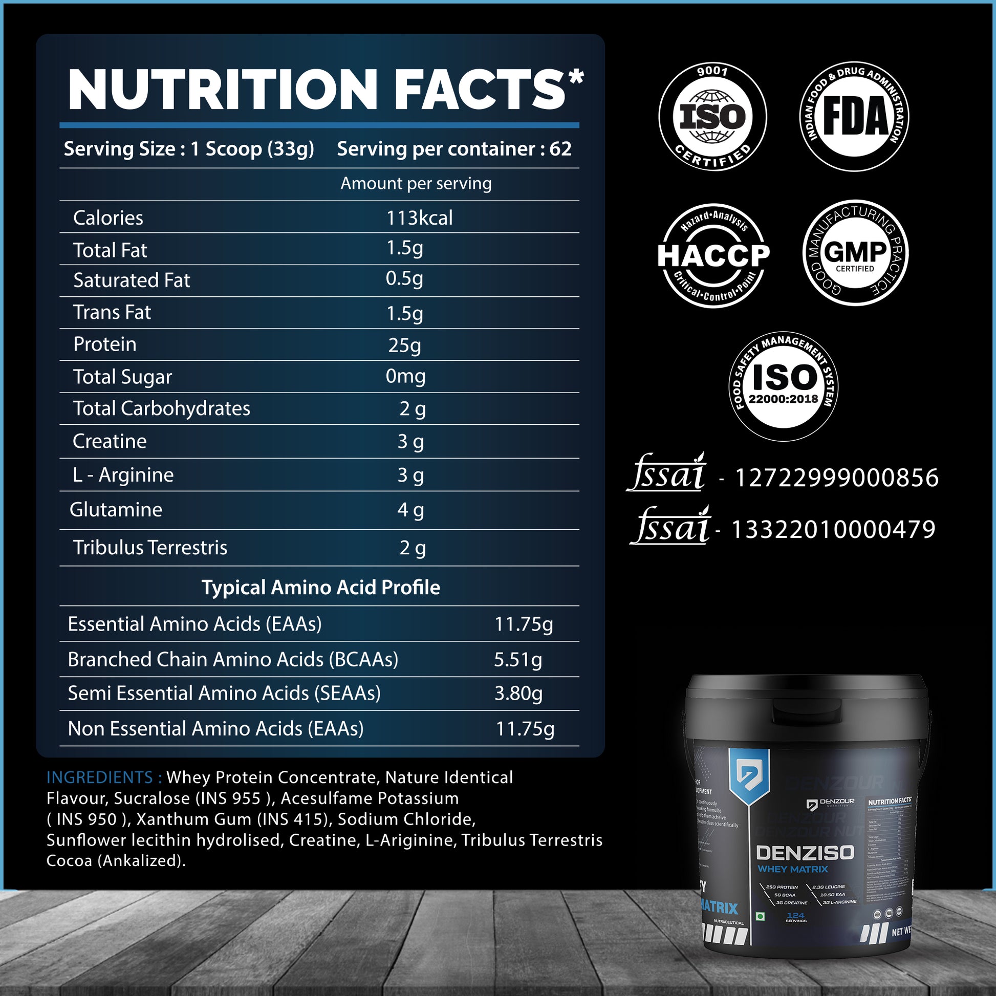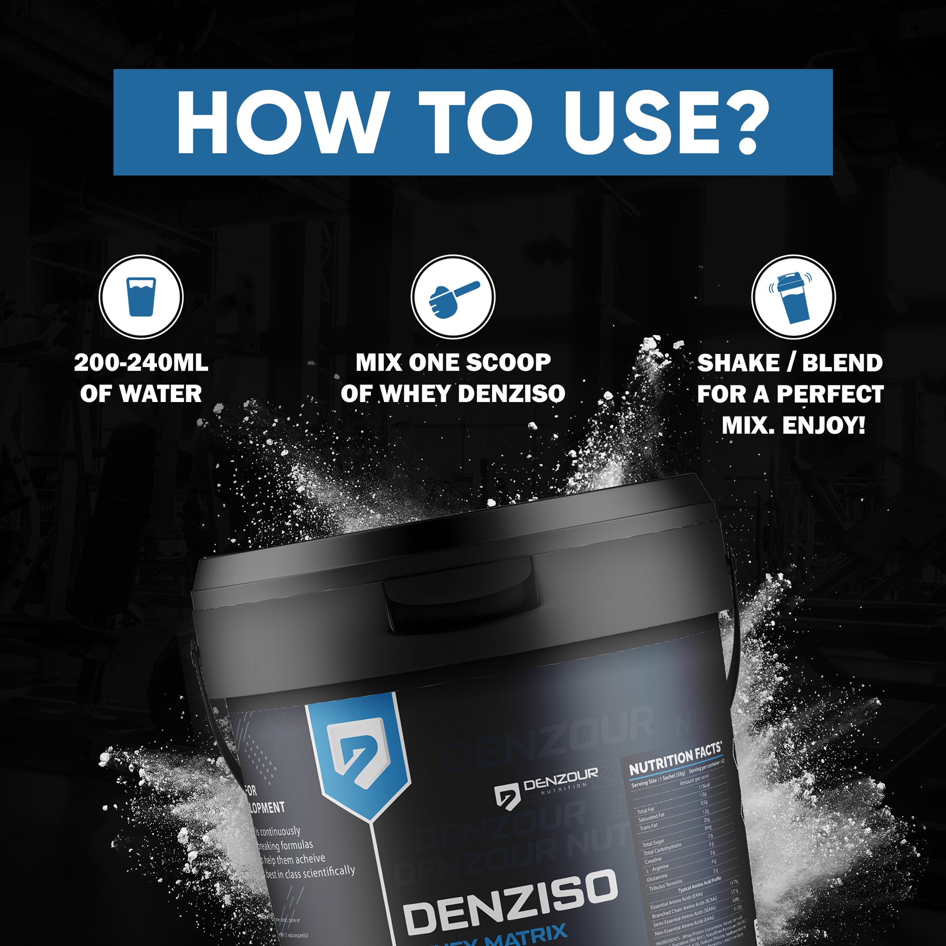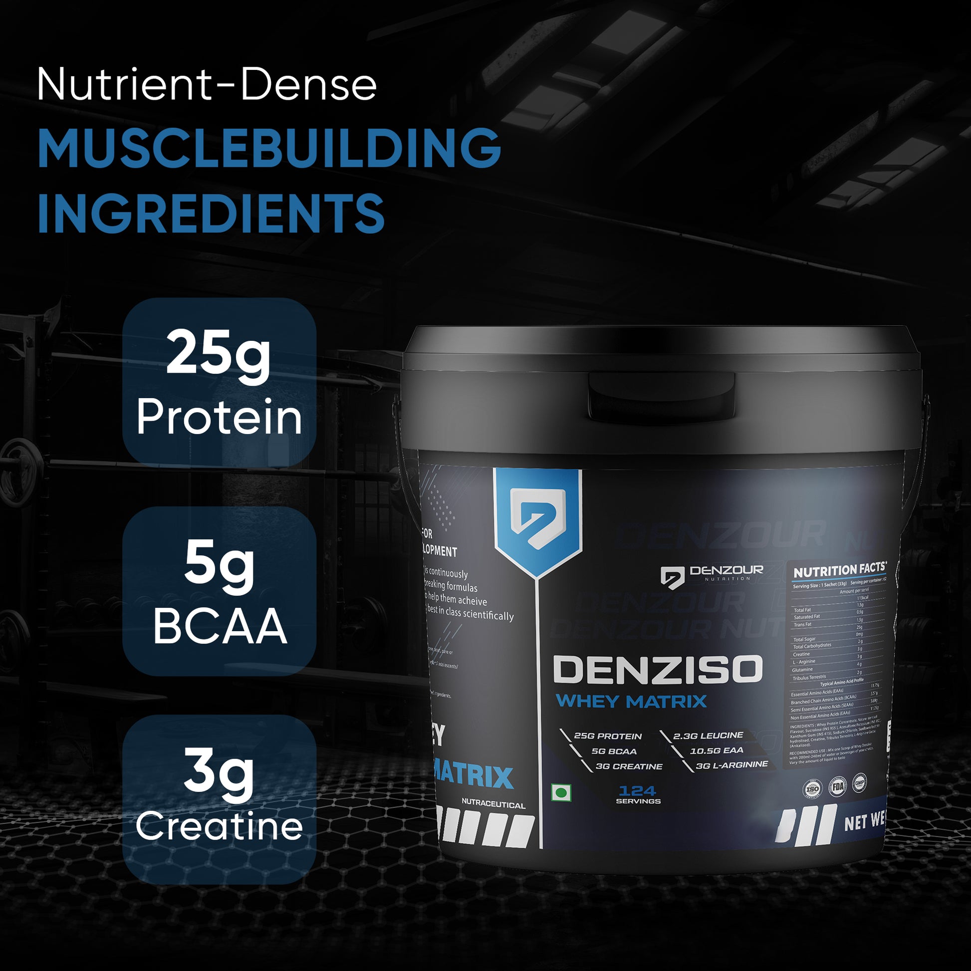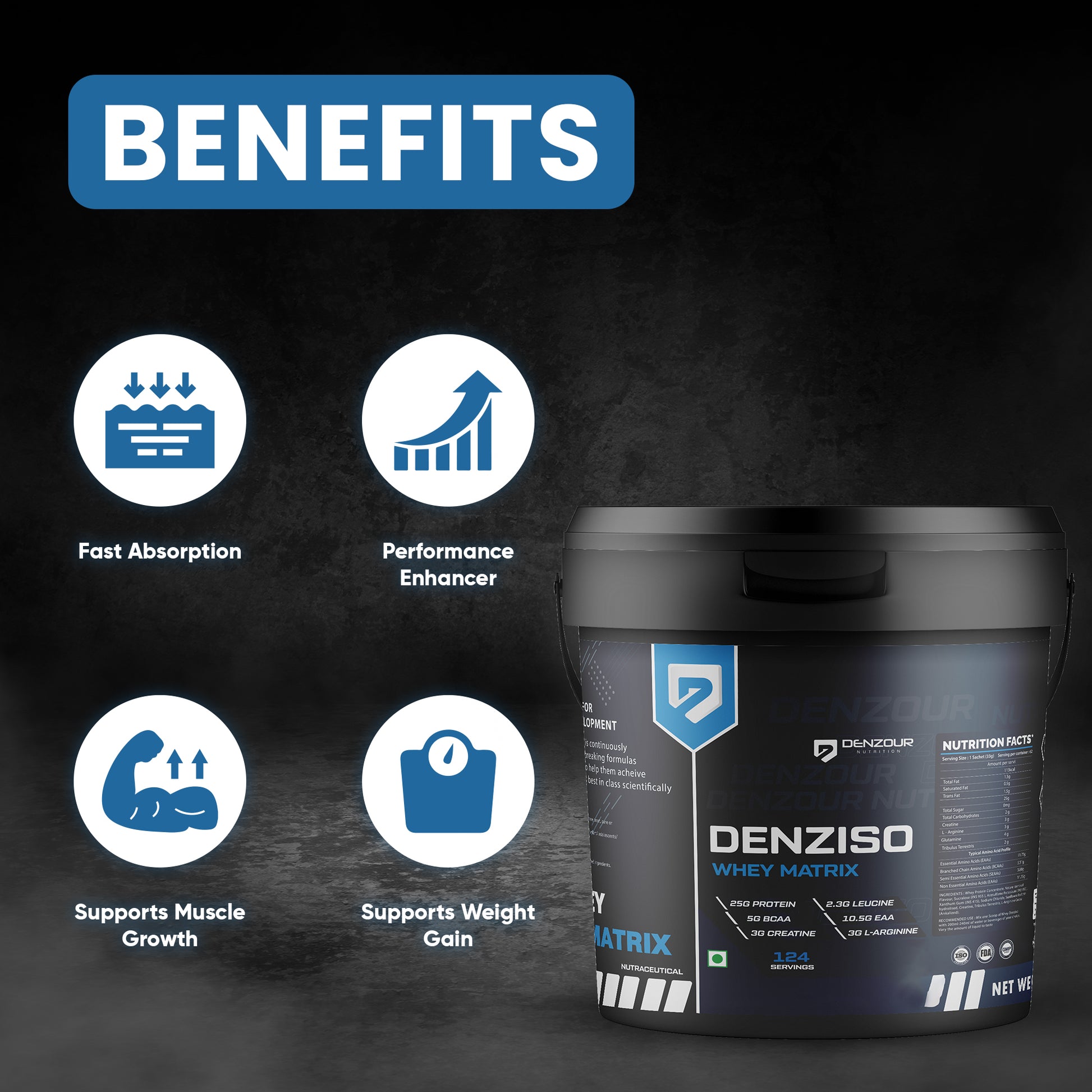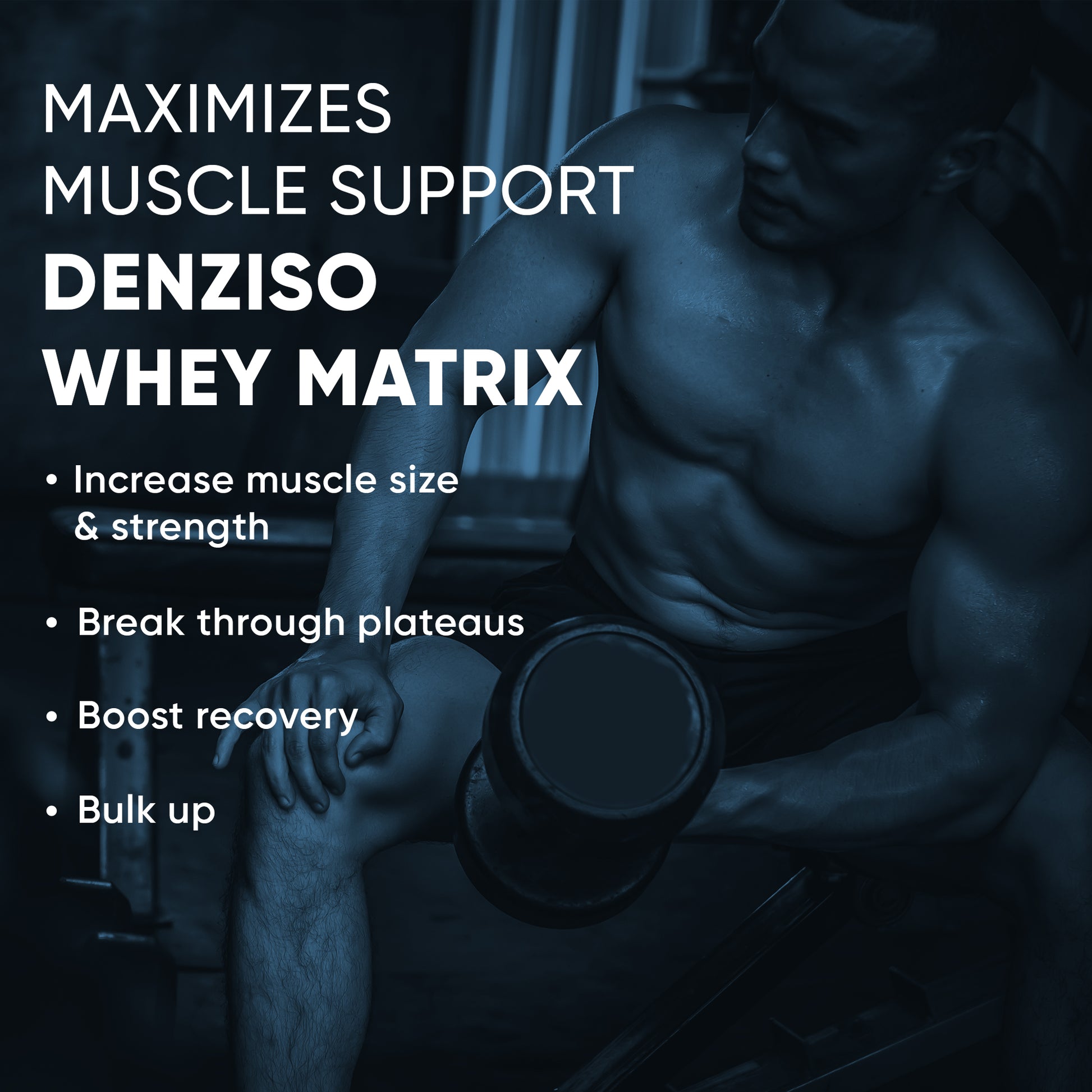 DENZOUR NUTRITION Denziso Whey Matrix Protein" is a protein supplement designed to aid in muscle recovery and strength improvement. It contains 25 grams of protein per serving, making it suitable for both men and women who are looking to enhance their workout results. The "Whey Matrix" suggests that the protein blend might consist of different types of whey proteins, which are known for their easy digestibility and fast absorption by the body.