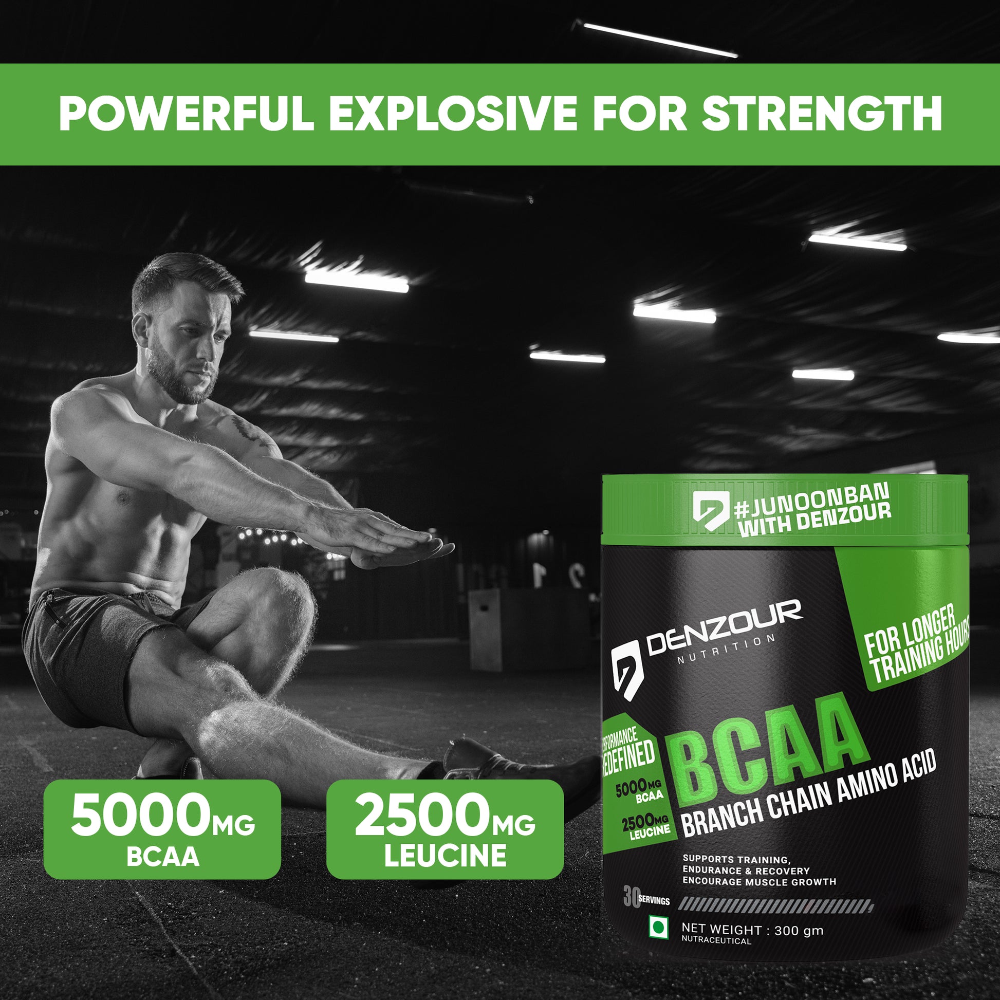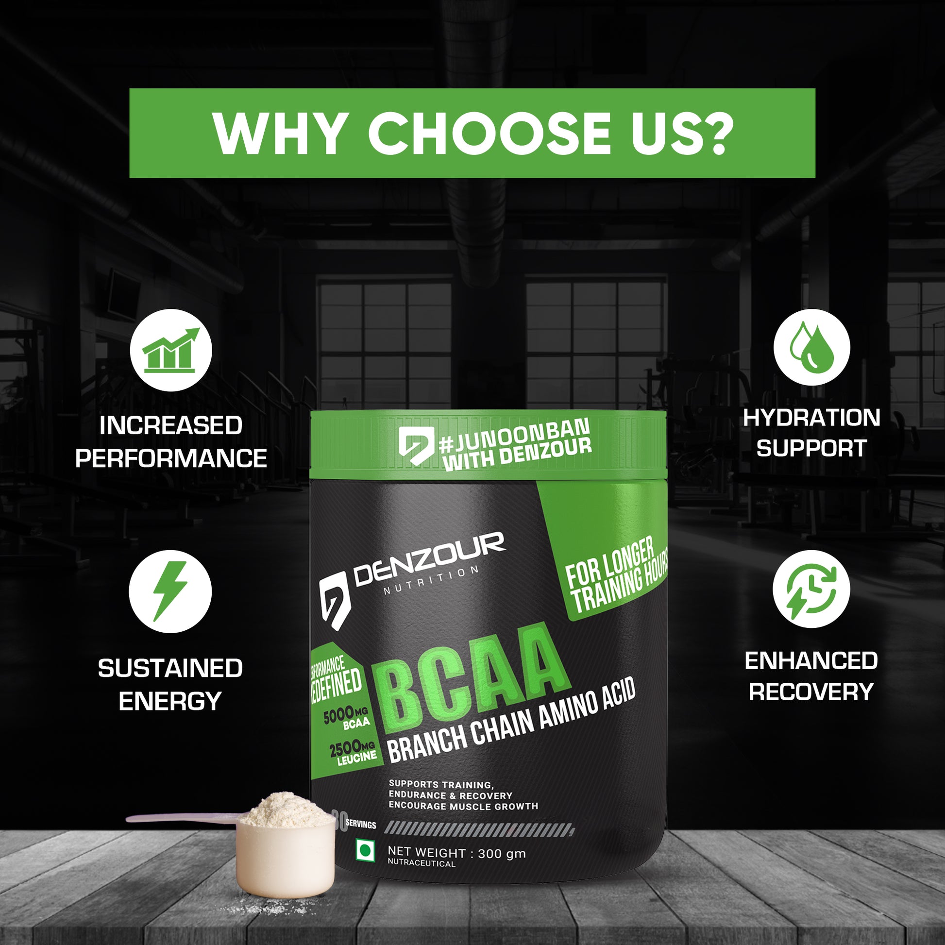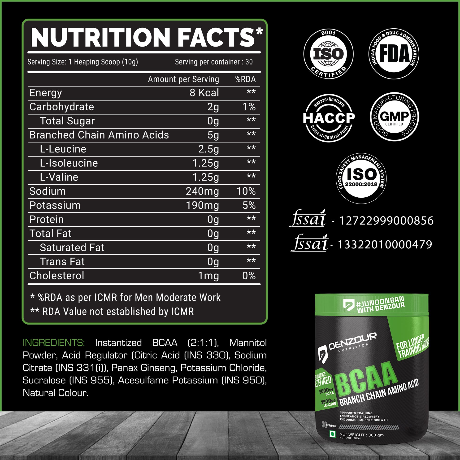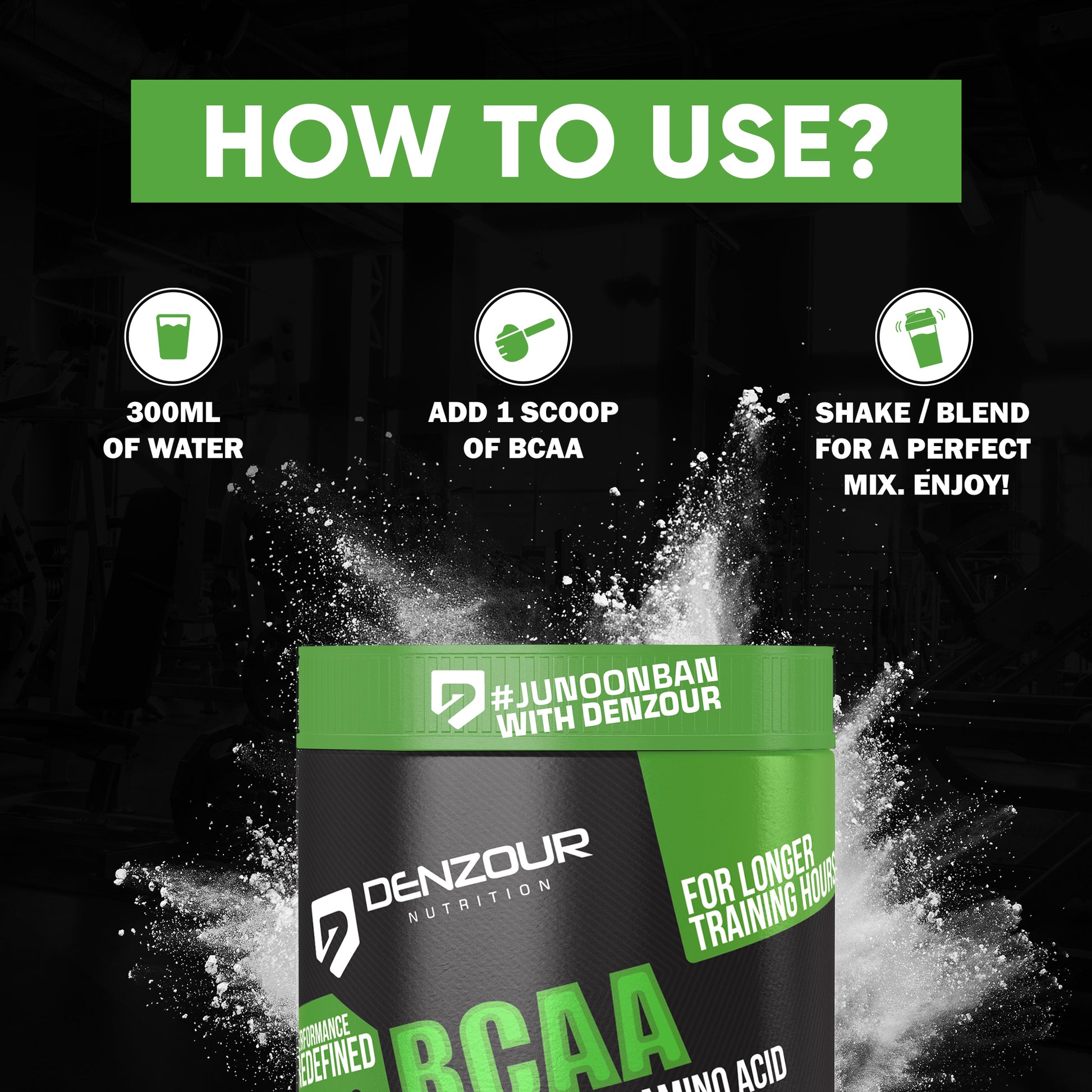 Denzour Nutrition BCAA is an effective and affordable BCAA supplement that helps sustain muscle strength during intense workouts and promotes muscle growth. With its unique blend of essential nutrients, it is designed to provide optimal support for active individuals. It is enriched with 7 grams of instantized BCAA in a 2:1:1 ratio, which helps prevent muscle breakdown after strenuous workouts. Additionally, 1 gram of Citrulline is included to enhance muscle strength, and 1 gram of Glutamine to improve recovery time and boost immunity.