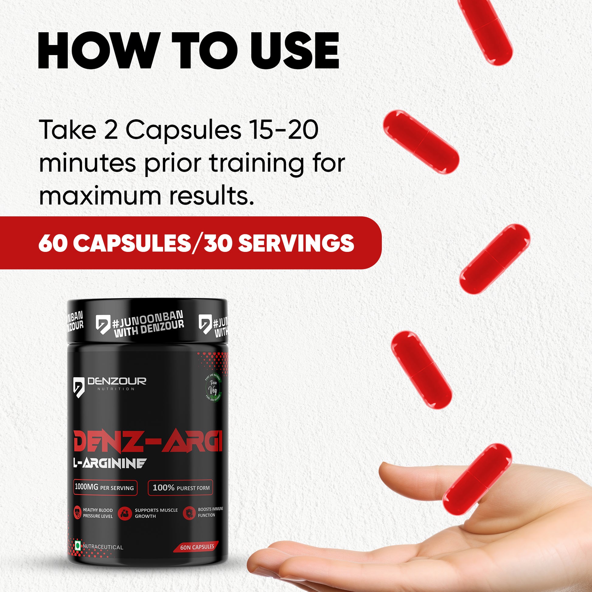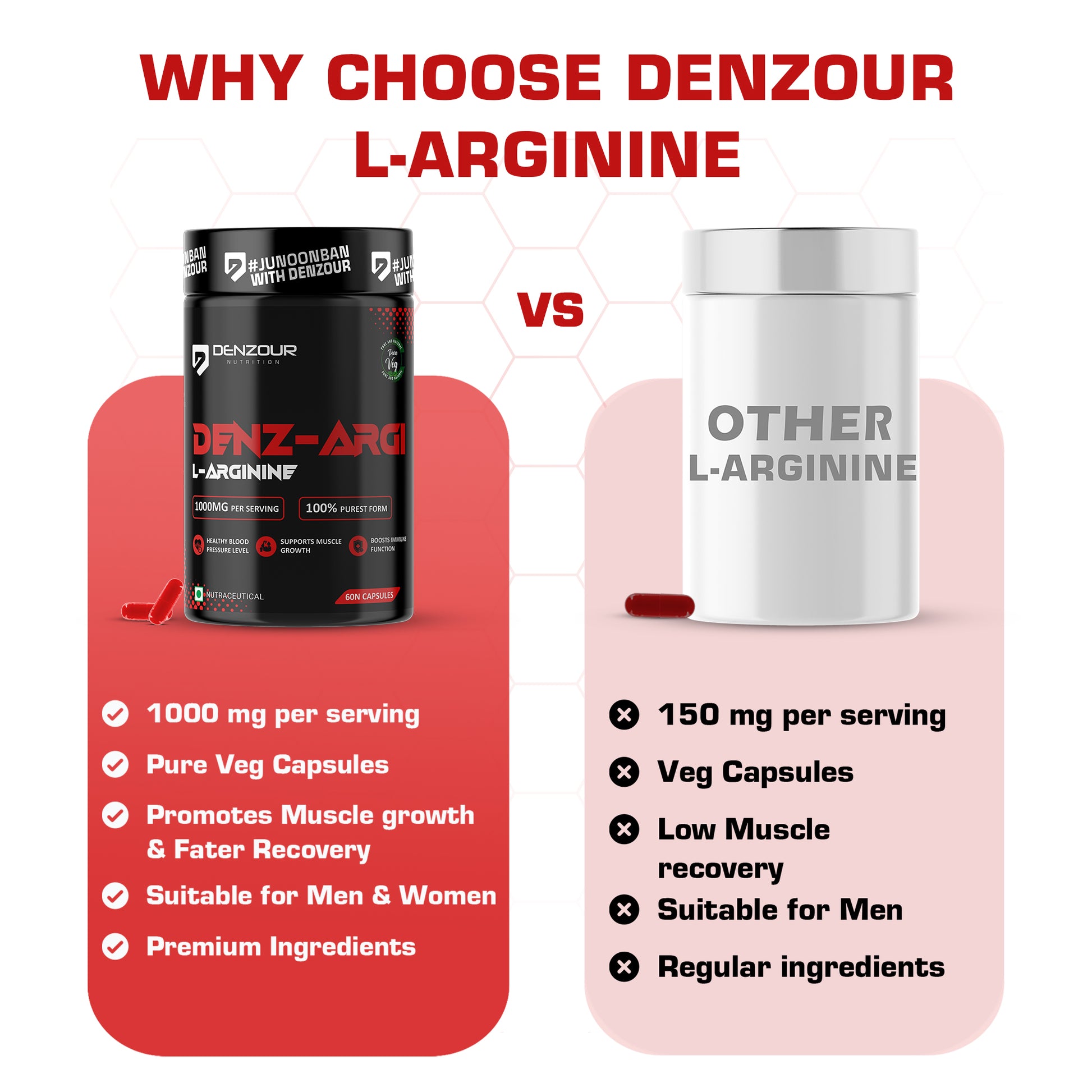 Denzour Nutrition L-Arginine 1000mg is a potent dietary supplement formulated to support muscle growth, healthy blood pressure levels, stamina, recovery, immune boosting, and energy levels for both men and women. Each veg capsule contains 1000mg of L-Arginine, a semi-essential amino acid that plays crucial roles in various physiological functions within the body.