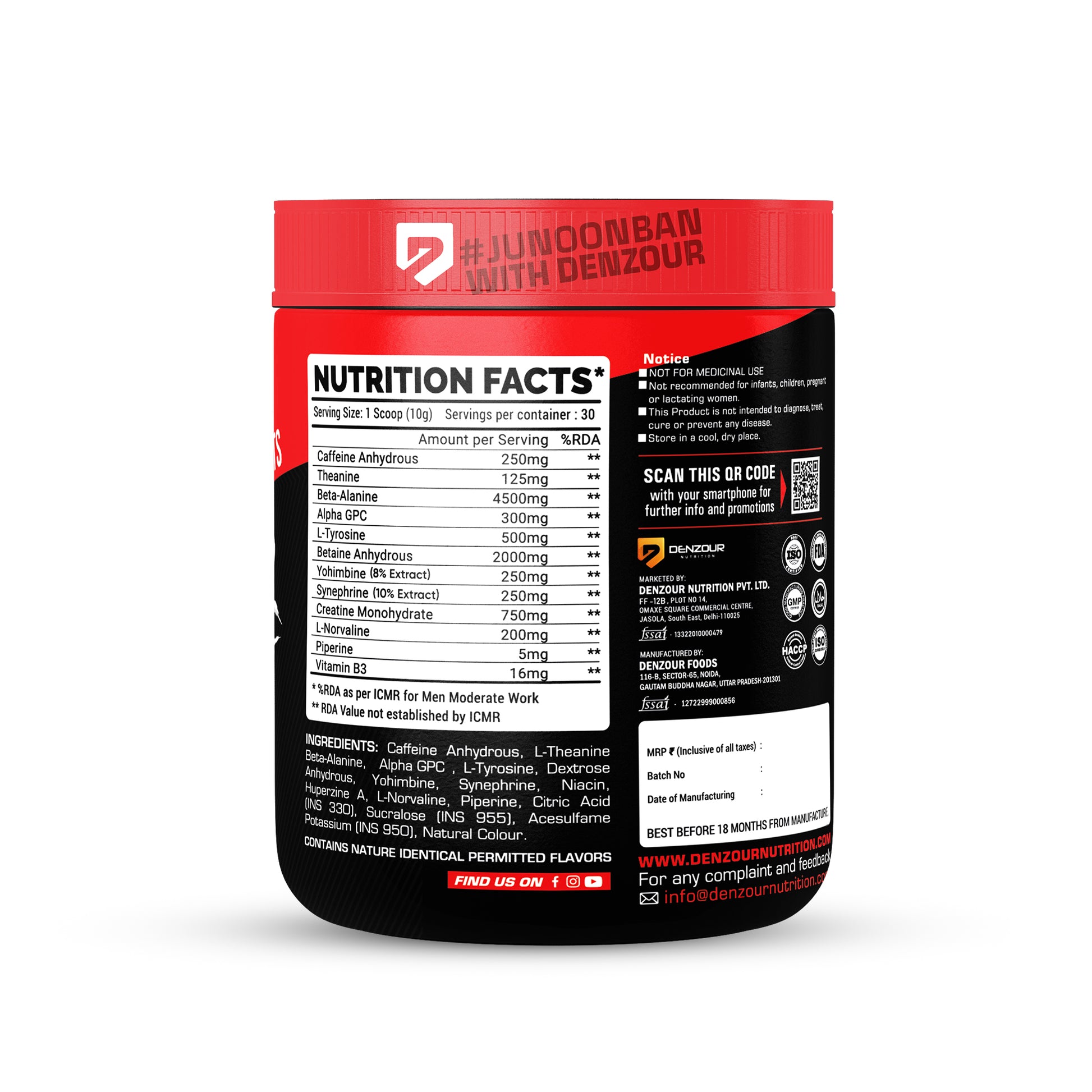 Caffeine Anhydrous, L-Theanine Beta-Alanine, Alpha GPC, L-Tyrosine, Dextrose Anhydrous, Yohimbine, Synephrine, Niacin, Huperzine A, L-Norvaline, Piperine, Citric Acid (INS 330), Sucralose (INS 955), Acesulfame Potassium (INS 950), Natural Colour.