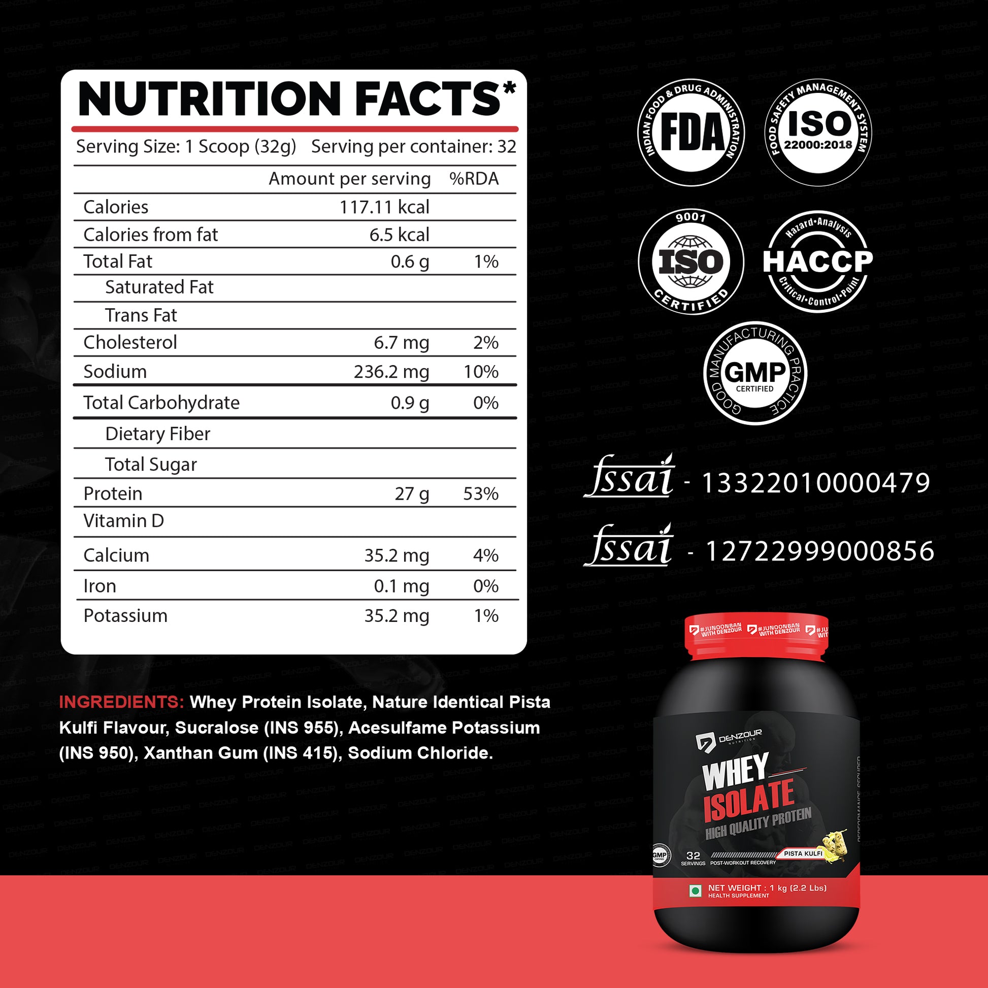Whey protein isolate, Cocoa Powder(Alkalized), Nature Identical Pista Kulfi Flavour, Sucralose (INS955), Acesulfame Potassium(INS950), Xanthan Gum (INS415) Sodium Chloride.